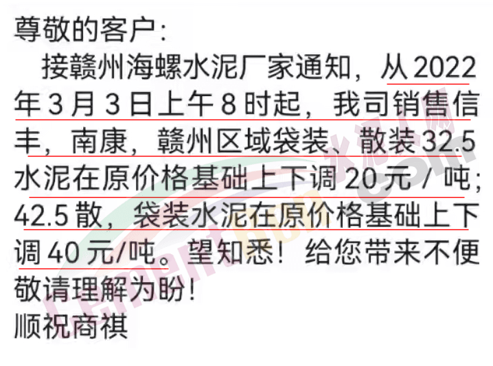 江西贛州海螺水泥經(jīng)銷商發(fā)通知稱,接贛州海螺水泥廠家通知,從2022 年3月3日上午8時(shí)起,公司銷售信豐、南康、贛州區(qū)域袋裝、散裝32.5水泥在原價(jià)格基礎(chǔ)上下調(diào)20元/噸;42.5散、袋裝水泥在原價(jià)格基礎(chǔ)上下調(diào)40元/噸。
