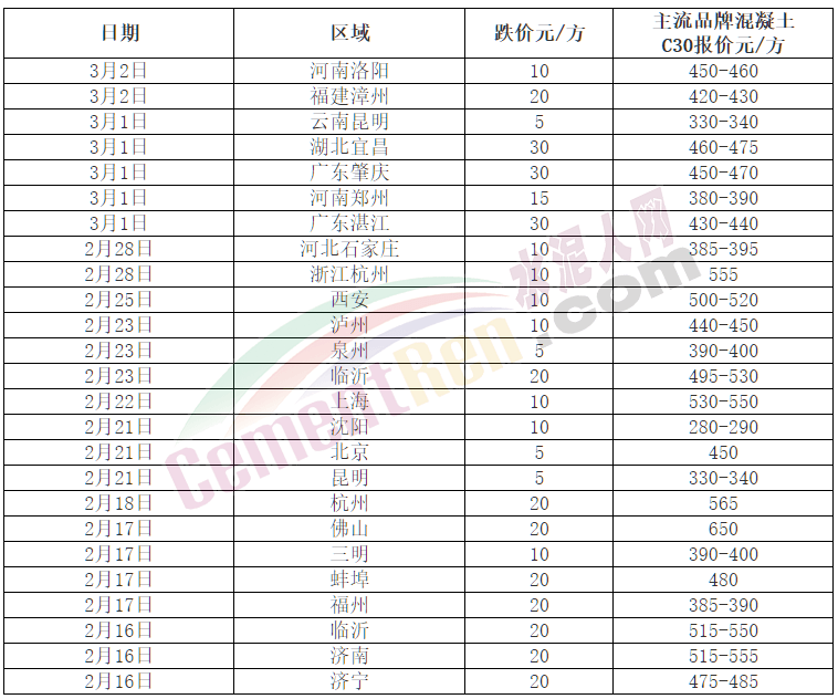 混凝土受原材料成本降低影響,市場價格下跌