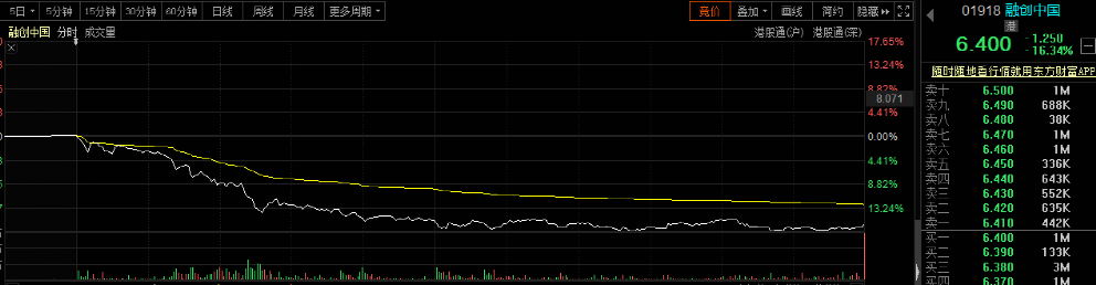 近日,合同銷售金額近6000億元的融創(chuàng)中國突然出現(xiàn)股債雙殺!開盤后就一路下殺,盤中跌幅超過17%,債券方面多筆殺跌,境內(nèi)債“21融創(chuàng)03”跌10%,美元債“SUNAC 7 1/2 02/01/24”等跌幅超過6%。