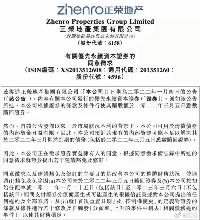 正榮地產(chǎn)公告稱,公司資源不足以支付2億美元永續(xù)債,正嘗試征求證券實益擁有人的同意,就證券提出若干建議豁免及修訂。