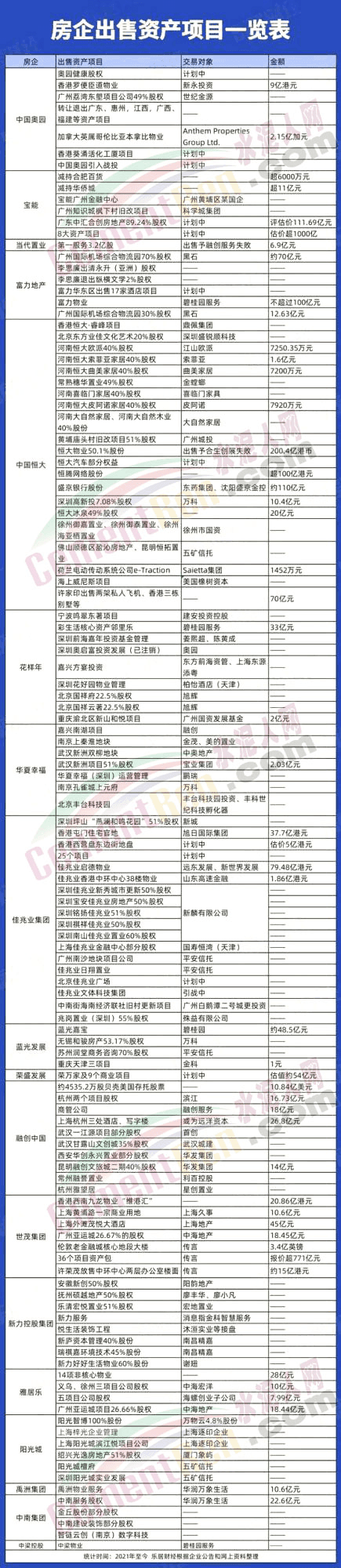 隨著地產(chǎn)調(diào)控政策趨緊,多家房地產(chǎn)企業(yè)的資金壓力持續(xù)上升,前有藍(lán)光、華夏幸福、泰禾,后有恒大、佳兆業(yè)、奧園,還有的則在暴雷的路上。房企高償債壓力之下,違約風(fēng)險日益加大,越來越多的放棄開始割肉賣身。恒大、融創(chuàng)、世茂、中南、禹洲、奧園、雅居樂、花樣年等房企,均已成功將部分資產(chǎn)轉(zhuǎn)讓出去。