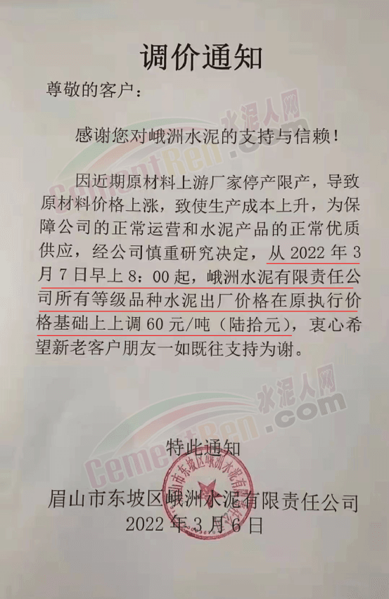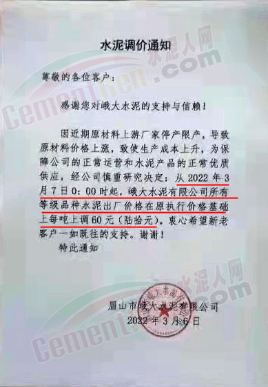 眉山市峨大水泥有限公司通知因近期原材料上游廠家停產(chǎn)限產(chǎn),導(dǎo)致原材料價(jià)格上漲,致使生產(chǎn)成本上升,為保證公司的正常運(yùn)營(yíng)和水泥產(chǎn)品的正常優(yōu)質(zhì)供應(yīng),經(jīng)公司慎重研究決定從2022年3月7日0時(shí)起峨大水泥有限公司所有等級(jí)品種水泥出廠價(jià)格在原執(zhí)行價(jià)格基礎(chǔ)上上調(diào)60元/噸。
