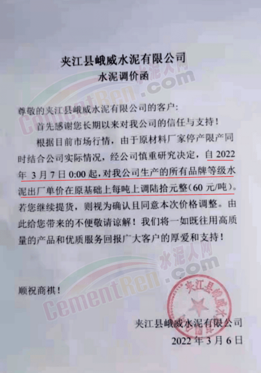 夾江縣峨威水泥有限公司通知,根據(jù)目前市場(chǎng)行情,由于原材料廠家停產(chǎn)限產(chǎn),結(jié)合公司實(shí)際情況,經(jīng)研究決定自2022年3月7日0時(shí)起,公司生產(chǎn)的所有品牌等級(jí)水泥出廠單價(jià)在原基礎(chǔ)上上調(diào)60元/噸。