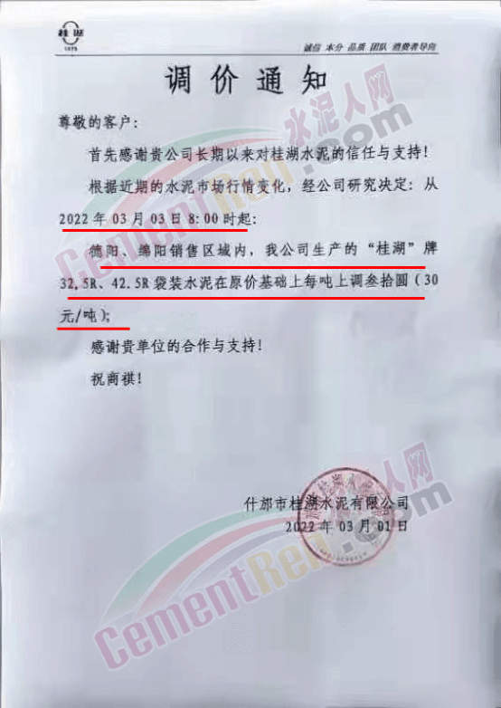 什邡市桂湖水泥有限公司通知從2022年3月3日8時(shí)起德陽、綿陽銷售區(qū)域內(nèi),公司生產(chǎn)的“桂湖”牌32.5R、42.5R袋裝水泥在原價(jià)基礎(chǔ)上上調(diào)30元/噸。