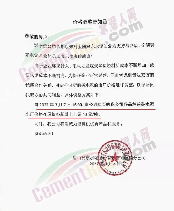唐山冀東水泥股份有限公司營(yíng)銷分公司通知,自 2022年3月7日16時(shí)起,各品種袋裝水泥出廠價(jià)格在原價(jià)格基礎(chǔ)上上調(diào)40元/噸。