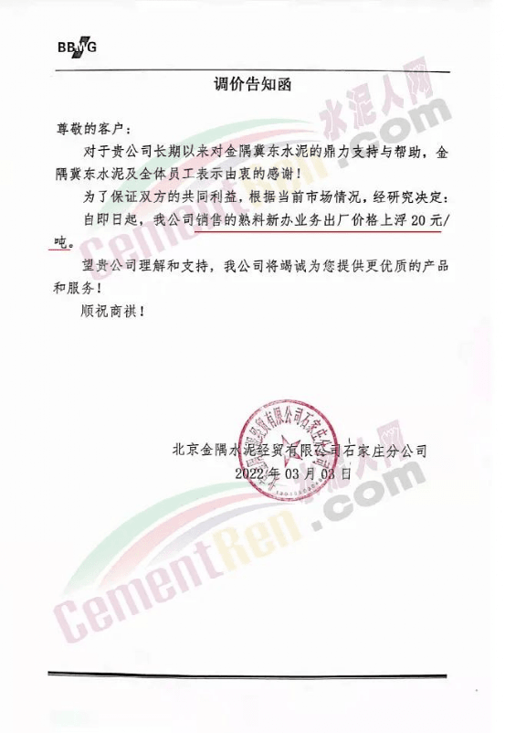 北京金隅水泥經(jīng)貿(mào)有限公司石家莊分公司3月3日通知公司銷售的熟料新辦業(yè)務(wù)出廠價(jià)格上浮 20元/噸。
