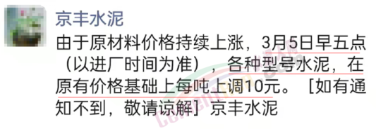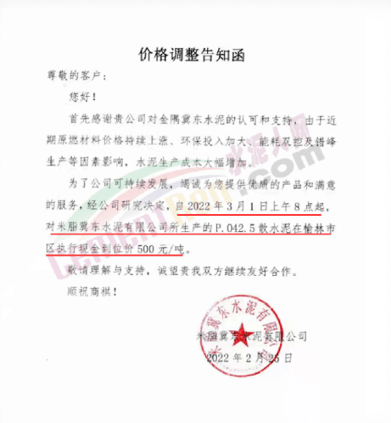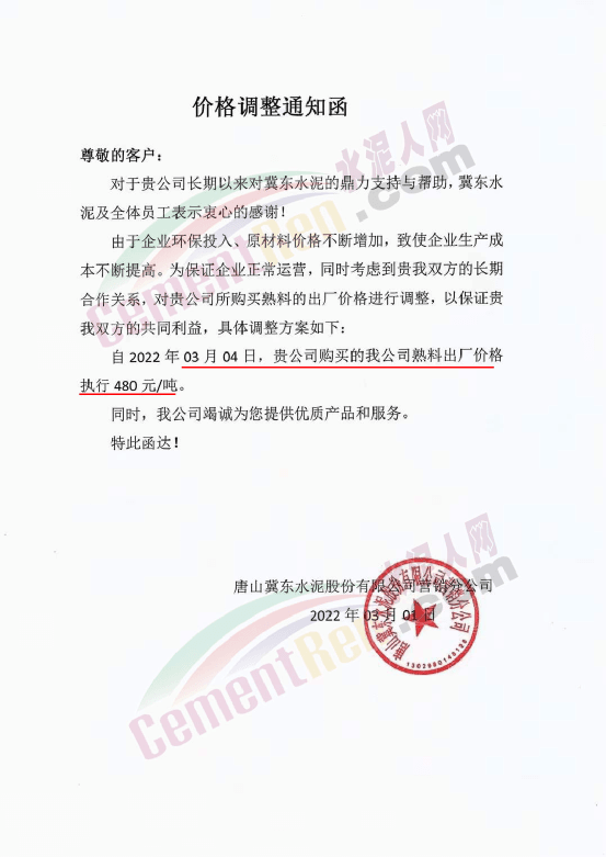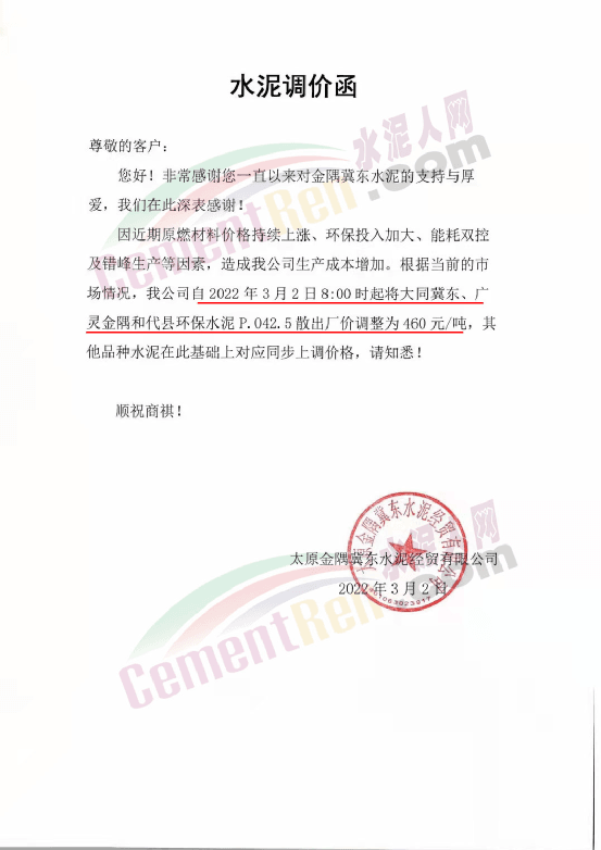 山西太原金隅冀東水泥經(jīng)貿(mào)有限公司通知,自2022年3月2日8時(shí)起將大同冀東、廣靈金隅和代縣環(huán)保水泥P.O42.5散出廠價(jià)調(diào)整為460元/噸,其他品種水泥在此基礎(chǔ)上對(duì)應(yīng)同步上調(diào)價(jià)格。