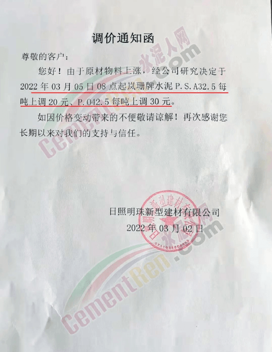 山東日照明珠新型建材有限公司通知,2022年3月5日8時(shí)起嵐珊牌水泥P.S.A32.5每噸上調(diào)20元、P.O42.5每噸上調(diào)30元。