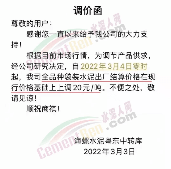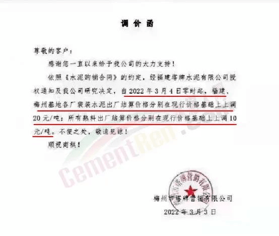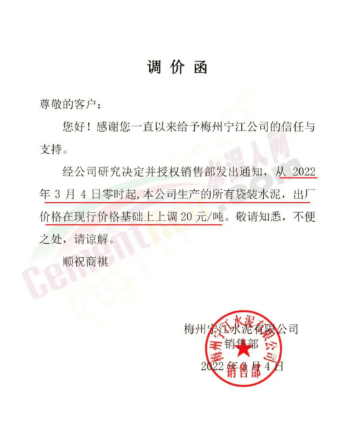 梅州寧江水泥有限公司銷售部通知,從2022年3月4日零時(shí)起,公司生產(chǎn)的所有袋裝水泥,出廠價(jià)格在現(xiàn)行價(jià)格基礎(chǔ)上上調(diào)20元/噸。