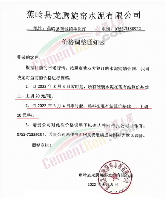蕉嶺縣龍騰旋窯水泥有限公司通知,自2022年3月4日零時(shí)起,所有袋裝水泥在現(xiàn)有結(jié)算價(jià)基礎(chǔ)上上調(diào)20元/噸,熟料在現(xiàn)有結(jié)算價(jià)基礎(chǔ)上上調(diào)10元/噸。