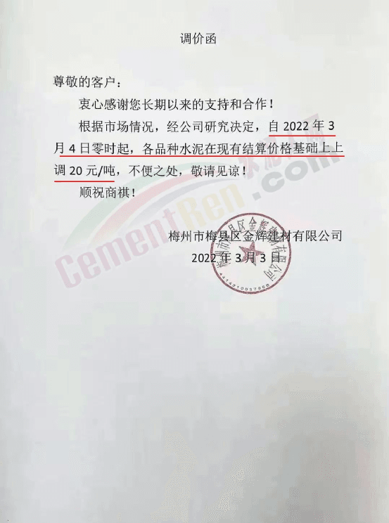 梅州市梅縣區(qū)金輝建材有限公司通知,自2022年3月4日零時(shí)起,各品種水泥在現(xiàn)有結(jié)算價(jià)格基礎(chǔ)上上調(diào)20元/噸。