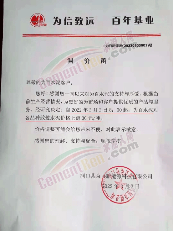 ?湖南省邵陽市洞口縣為百新能源料技有限公司通知,自 2022年3月3日8時(shí)起,為百水泥對(duì)各品種散裝水泥價(jià)格上調(diào)30元/噸。