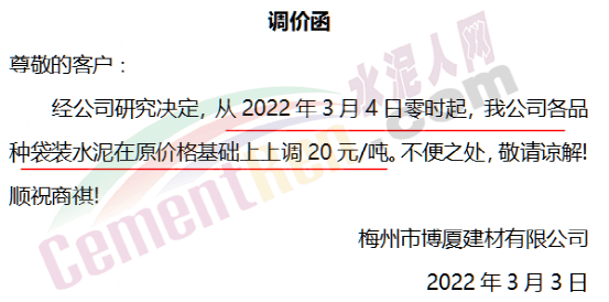 梅州市博廈建材有限公司通知從2022年3月4日零時(shí)起,公司各品種袋裝水泥在原價(jià)格基礎(chǔ)上上調(diào)20元/噸。