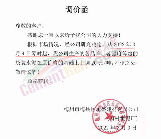梅州市梅縣區(qū)永盛建材有限公司通知,從2022年3月4日零時(shí)起,公司生產(chǎn)的各品牌、各強(qiáng)度等級(jí)的袋裝水泥在原價(jià)格的基礎(chǔ)上上調(diào)20元/噸。
