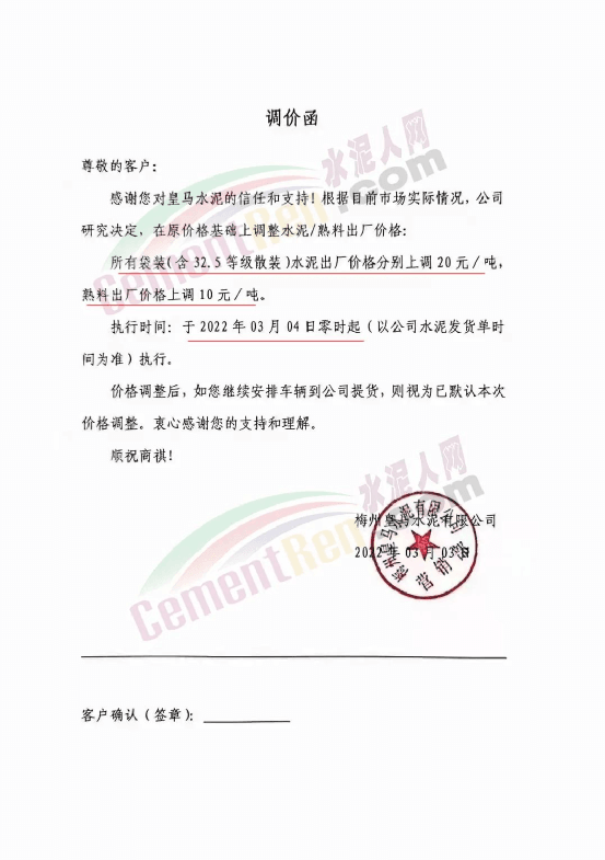 梅州皇馬水泥有限公司通知,自2022年3月4日零時(shí)起所有袋裝(含32.5等級(jí)散裝)水泥出廠價(jià)格分別上調(diào) 20元/噸,熟料出廠價(jià)格上調(diào)10元/噸。