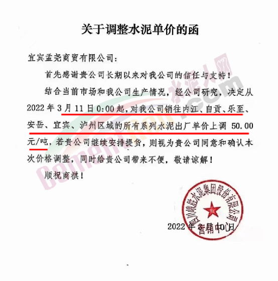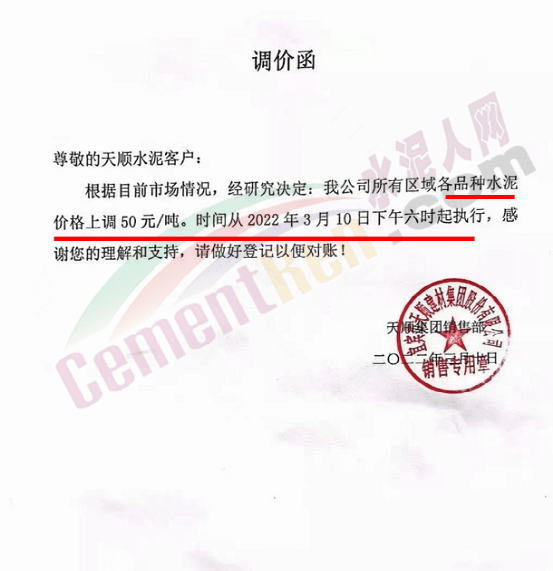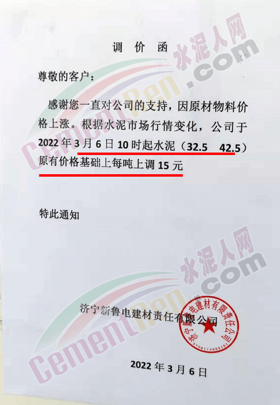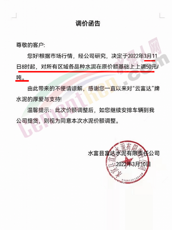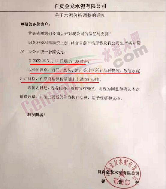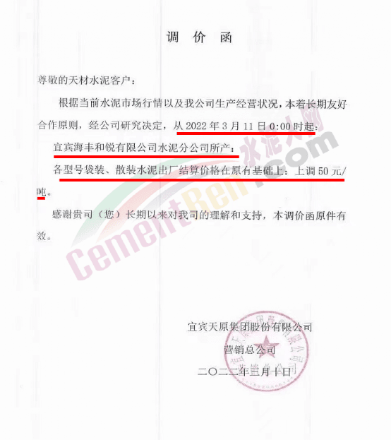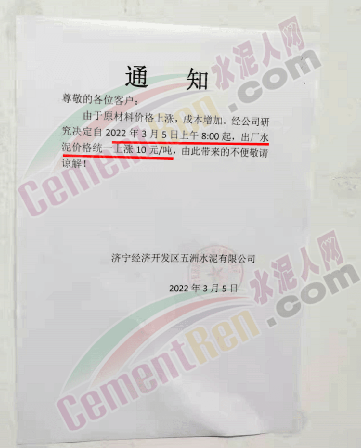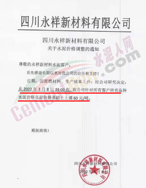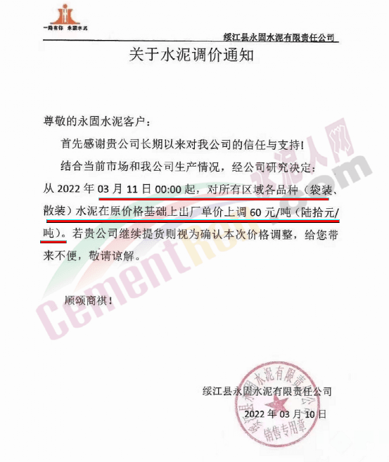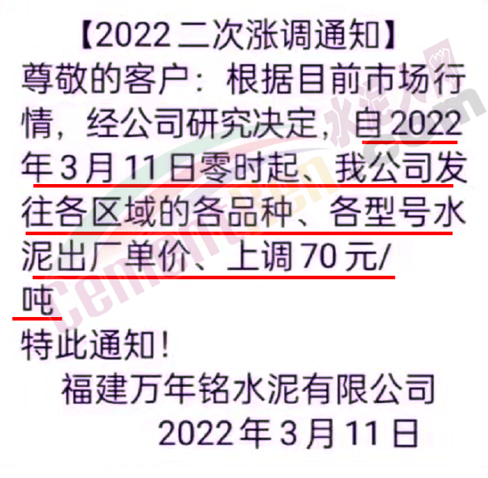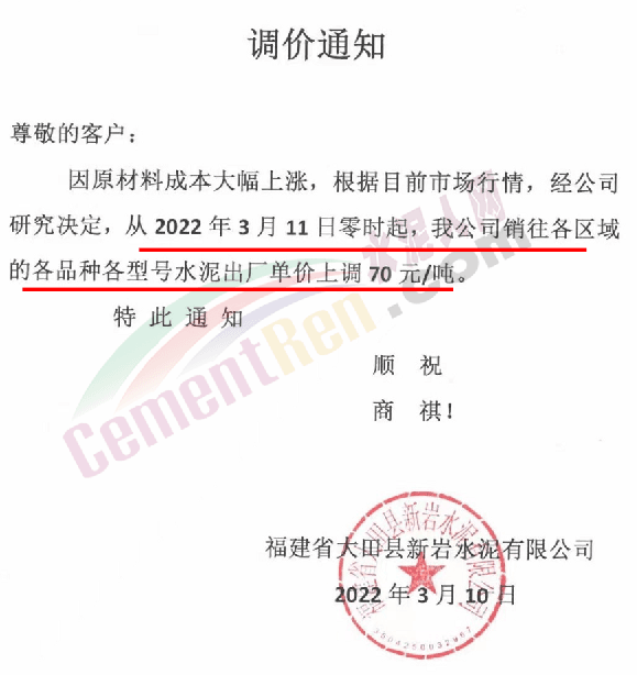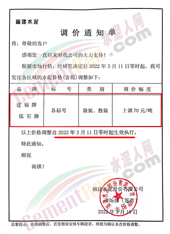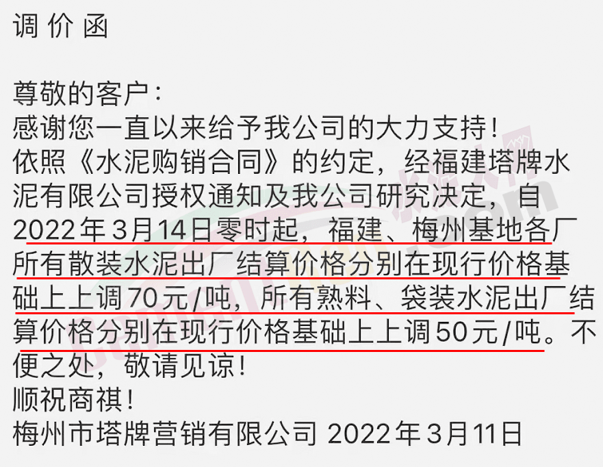 梅州市塔牌營(yíng)銷有限公司通知,依照《水泥購(gòu)銷合同》的約定,經(jīng)福建塔牌水泥有限公司授權(quán)通知及我公司研究決定,自2022年3月14日零時(shí)起,福建、梅州基地各廠所有散裝水泥出廠結(jié)算價(jià)格分別在現(xiàn)行價(jià)格基礎(chǔ)上上調(diào)70元/噸,所有熟料、袋裝水泥出廠結(jié)算價(jià)格分別在現(xiàn)行價(jià)格基礎(chǔ)上上調(diào)50元/噸。