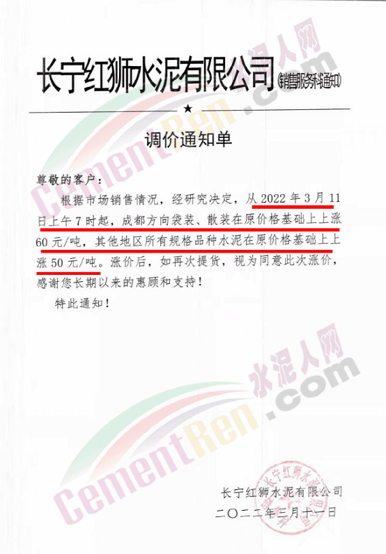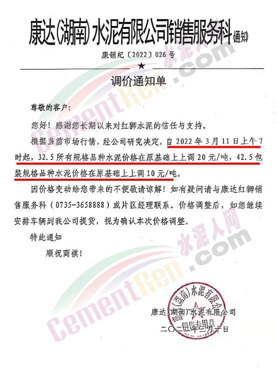 據(jù)水泥人網(wǎng)了解,春節(jié)后開工至今,湖南各區(qū)域水泥價(jià)格普遍呈上漲趨勢(shì)。紅獅水泥旗下康達(dá)(湖南)水泥有限公司銷售服務(wù)科通知,根據(jù)當(dāng)前市場(chǎng)行情,經(jīng)公司研究決定,自2022年3月11日上午7時(shí)起,32.5所有規(guī)格品種水泥價(jià)格在原基礎(chǔ)上上調(diào)20元/噸,42.5包裝規(guī)格品種水泥價(jià)格在原基礎(chǔ)上上調(diào)10元/噸。