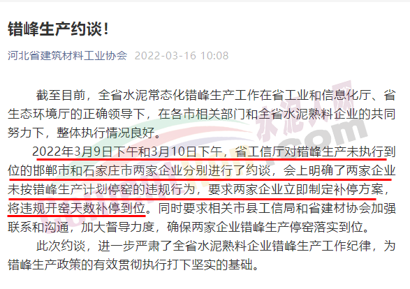 同期,河北省建筑材料工業(yè)協(xié)會(huì)發(fā)消息稱,2022年3月9日下午和3月10日下午,河北省工信廳對(duì)錯(cuò)峰生產(chǎn)未執(zhí)行到位的邯鄲市和石家莊市兩家企業(yè)分別進(jìn)行了約談,會(huì)上明確了兩家企業(yè)未按錯(cuò)峰生產(chǎn)計(jì)劃停窯的違規(guī)行為,要求兩家企業(yè)立即制定補(bǔ)停方案,將違規(guī)開窯天數(shù)補(bǔ)停到位。同時(shí)要求相關(guān)市縣工信局和省建材協(xié)會(huì)加強(qiáng)聯(lián)系和溝通,加大督導(dǎo)力度,確保兩家企業(yè)錯(cuò)峰生產(chǎn)停窯落實(shí)到位。