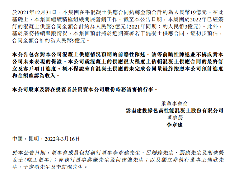 于2021年12月31日,集團(tuán)在手混凝土供應(yīng)合同結(jié)轉(zhuǎn)金額合計約為人民幣19億元。在此基礎(chǔ)上,集團(tuán)繼續(xù)積極組織開展?fàn)I銷工作。截至3月16日,集團(tuán)于2022年已經(jīng)簽訂的混凝土供應(yīng)合同金額合計約為人民幣5億元(2021年同期:約人民幣3億元)。此外,基于業(yè)務(wù)持續(xù)跟蹤情況,集團(tuán)預(yù)計將于近期簽署若干混凝土供應(yīng)合同,經(jīng)初步預(yù)估,合同金額合計約為人民幣9億元。
