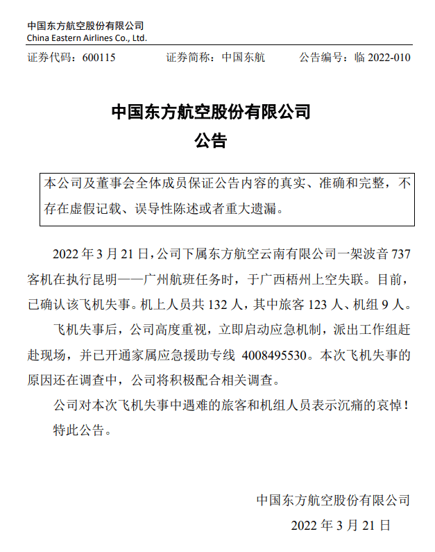 中國東航3月21日晚間公告,公司下屬東方航空云南有限公司一架波音737客機(jī)在執(zhí)行昆明——廣州航班任務(wù)時,于廣西梧州上空失聯(lián)。目前,已確認(rèn)該飛機(jī)失事。機(jī)上人員共132人,其中旅客123人、機(jī)組9人。