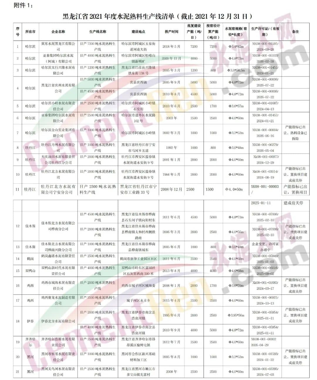 附件:1.黑龍江省2021年度水泥熟料生產(chǎn)線清單