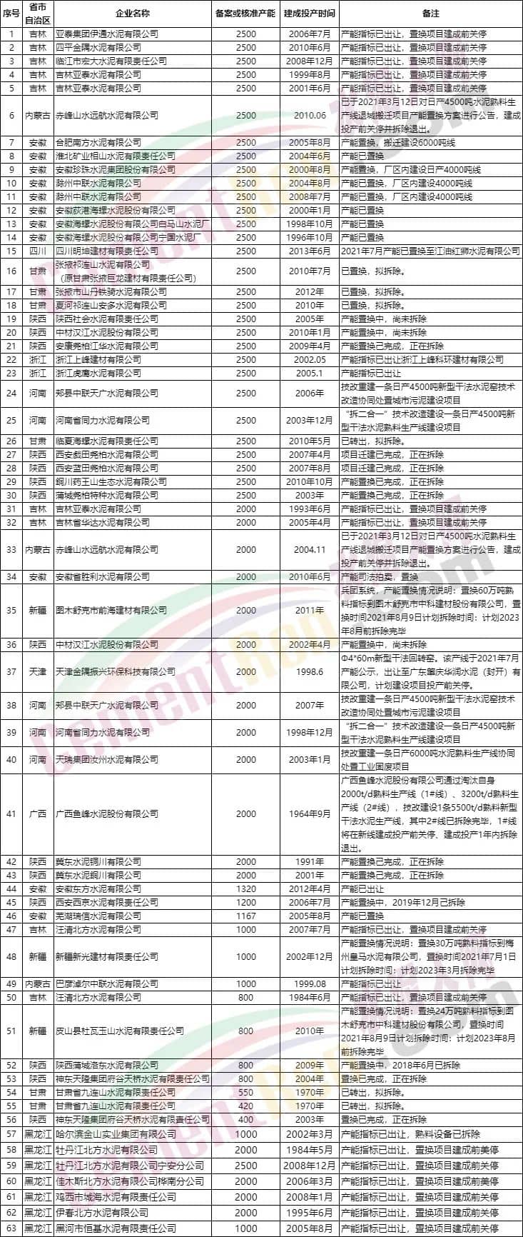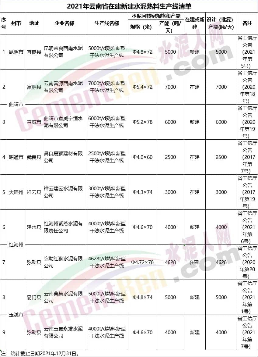 近期,寧夏、內(nèi)蒙、新疆、江蘇、浙江、山東、安徽 、云南、四川、河南、吉林、廣西、甘肅、陜西、天津、河北、貴州、黑龍江等18個省市自治區(qū)分別發(fā)布了截止2021年12月31日的水泥熟料生產(chǎn)線清單。部分省份公布的清單中不僅明確生產(chǎn)線設(shè)計(jì)產(chǎn)能、實(shí)際產(chǎn)能、窯規(guī)格尺寸以及建成投產(chǎn)時間。還有部分省市還將產(chǎn)能置換項(xiàng)目以及新建、在建項(xiàng)目也都明確標(biāo)注出來了。