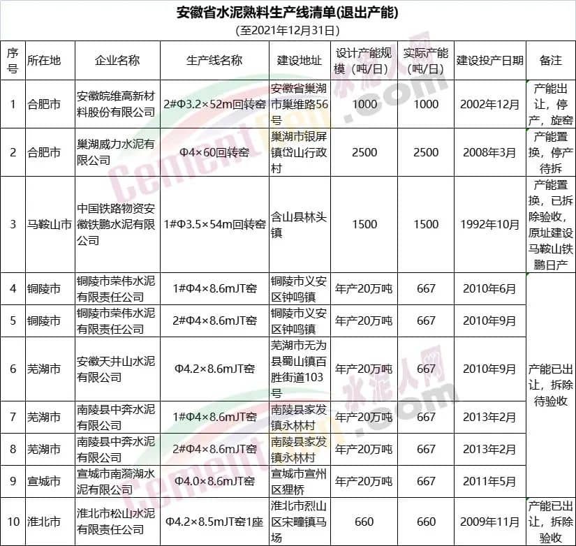 海螺水泥的大本營安徽省截止2021年12月31日共退出10條生產(chǎn)線,退出生產(chǎn)線建成投產(chǎn)日期從1992年至2013年均有,其中包括7條JT窯生產(chǎn)線,退出產(chǎn)能合計(jì)289.8萬噸/年。