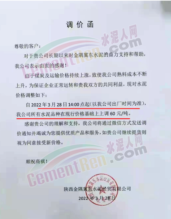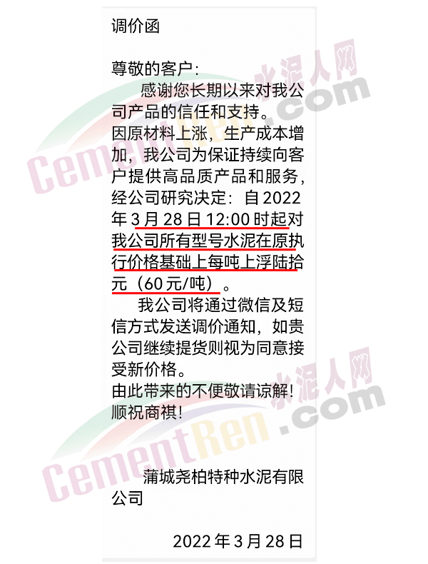 蒲城堯柏特種水泥通知,3月28日12時起,所有型號水泥上漲60元/噸。