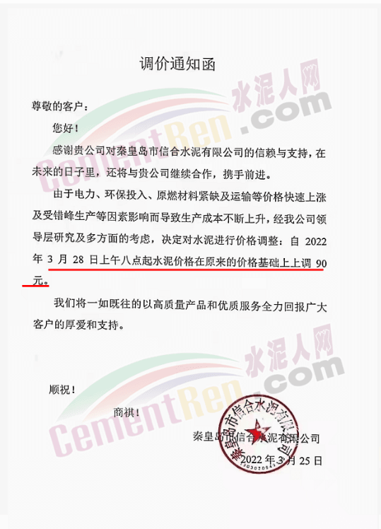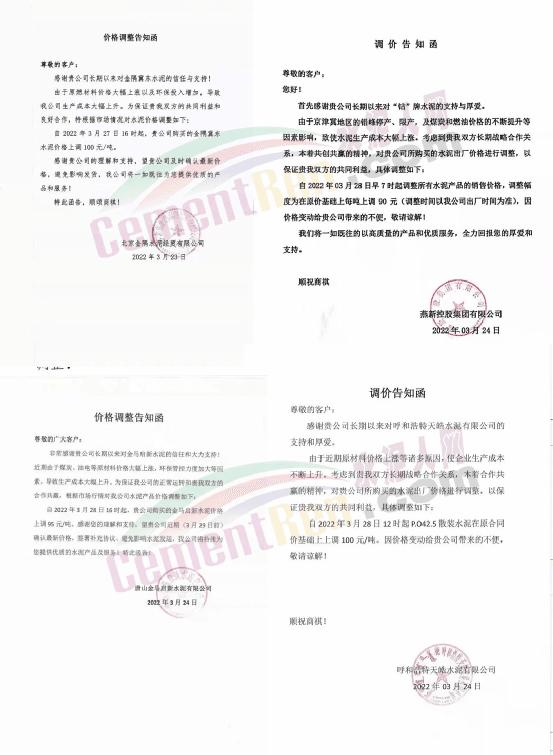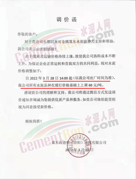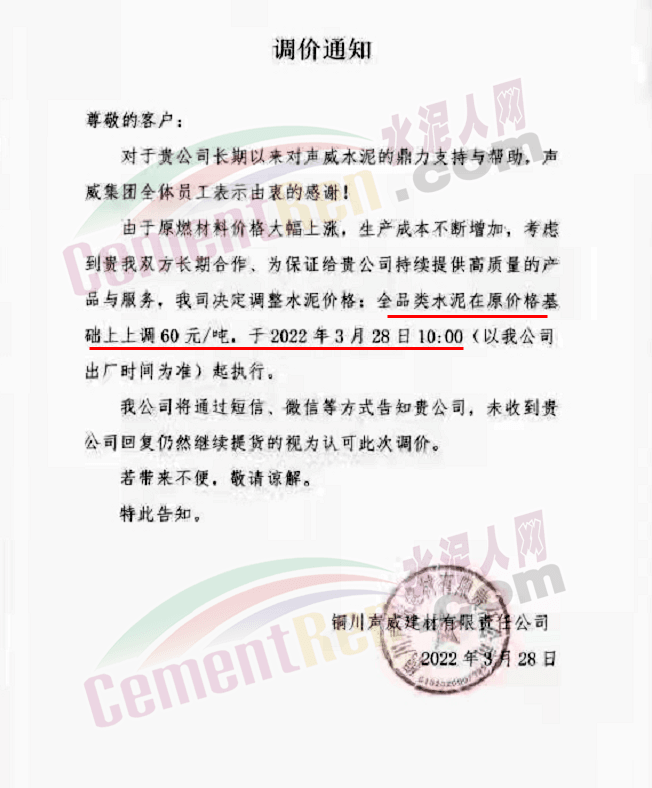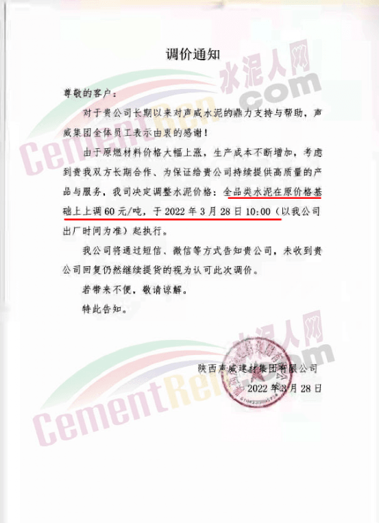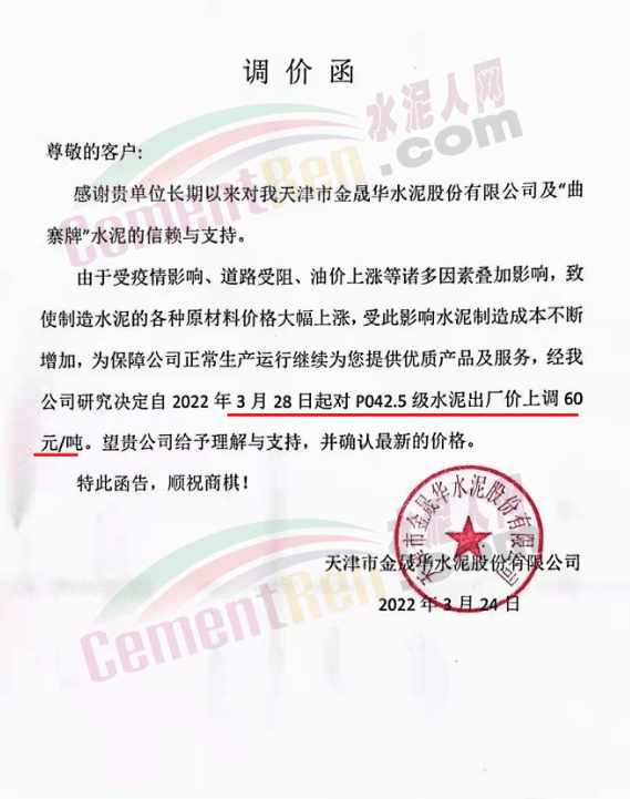 天津山水水泥有限公司調(diào)價函稱,近期受疫情、錯峰生產(chǎn)、油價上漲等多方面因素持續(xù)影響,原材料及運輸成本大幅上漲,水泥制造成本激增。為保障公司正常生產(chǎn)運行,繼續(xù)為客戶提供優(yōu)質(zhì)產(chǎn)品及服務(wù),經(jīng)廠家決定水泥價格自3月28日上午8時起P.O42.5散裝水泥上調(diào)60元/噸。