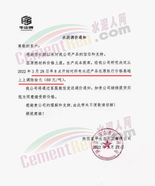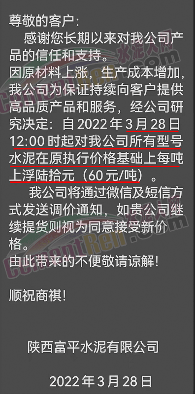陜西富平水泥有限公司通知,3月28日12時起,所有型號水泥上浮60元/噸。