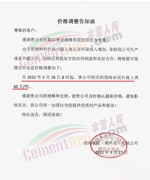 渤海水泥(葫蘆島)有限公司通知,3月28日8時起,渤海水泥價格上調(diào)60元/噸。