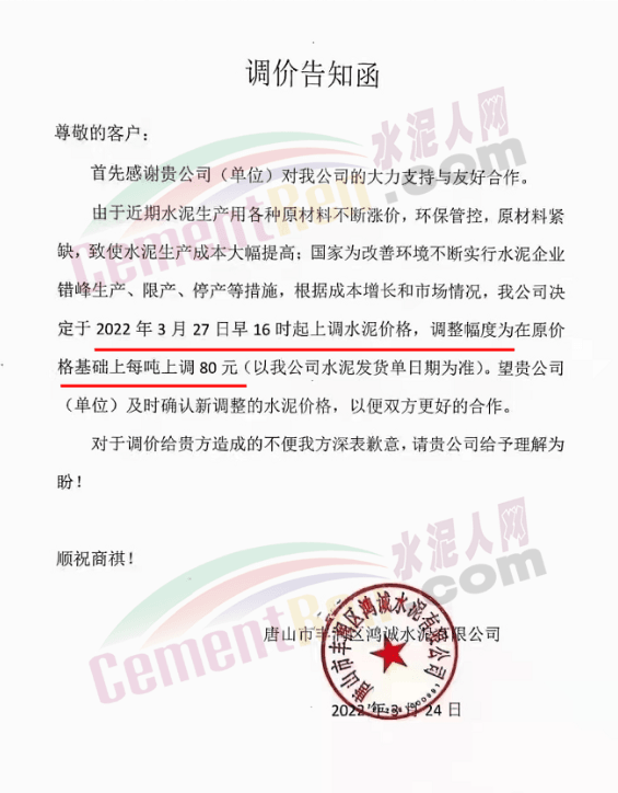 唐山市豐潤區(qū)鴻誠水泥有限公司通知,3月27日16時起上調(diào)水泥價格80元/噸。