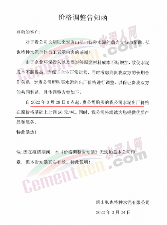 唐山弘也特種水泥通知自3月28日0時起,水泥價格上調(diào)50元/噸。