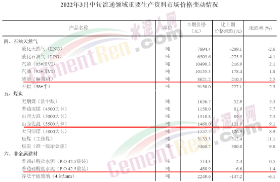 國家統(tǒng)計局?jǐn)?shù)據(jù)顯示,2022年3月中旬流通領(lǐng)域石油、天然氣、煤炭、P.O42.5散裝水泥較3月上旬同比均為上漲,其中0號柴油上漲210.3元/噸,漲幅2.5%;山西優(yōu)混550大卡煤炭上漲121.9元/噸,漲幅9.1%;P.O42.5散裝水泥上漲6.6元/噸,漲幅1.4%。
