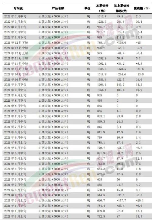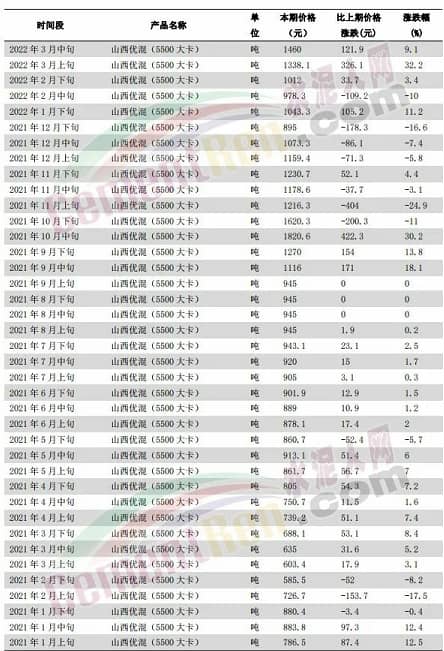 據(jù)水泥人網(wǎng)了解,煤價(jià)每變動(dòng)100元,對(duì)水泥成本影響大約在10-15元/噸。以水泥企業(yè)燒成系統(tǒng)常用5000-5500大卡混煤為例,國(guó)家統(tǒng)計(jì)局?jǐn)?shù)據(jù),流通領(lǐng)域山西大混(5000大卡)2021年1月上旬為742.5元/噸,今年3月中旬為1310.8元/噸,上漲了568.3元/噸,漲幅約77%;山西優(yōu)混(5500大卡)2021年1月上旬為786.5元/噸,2022年3月中旬為1460元/噸,上漲了673.5元/噸,漲幅86%。