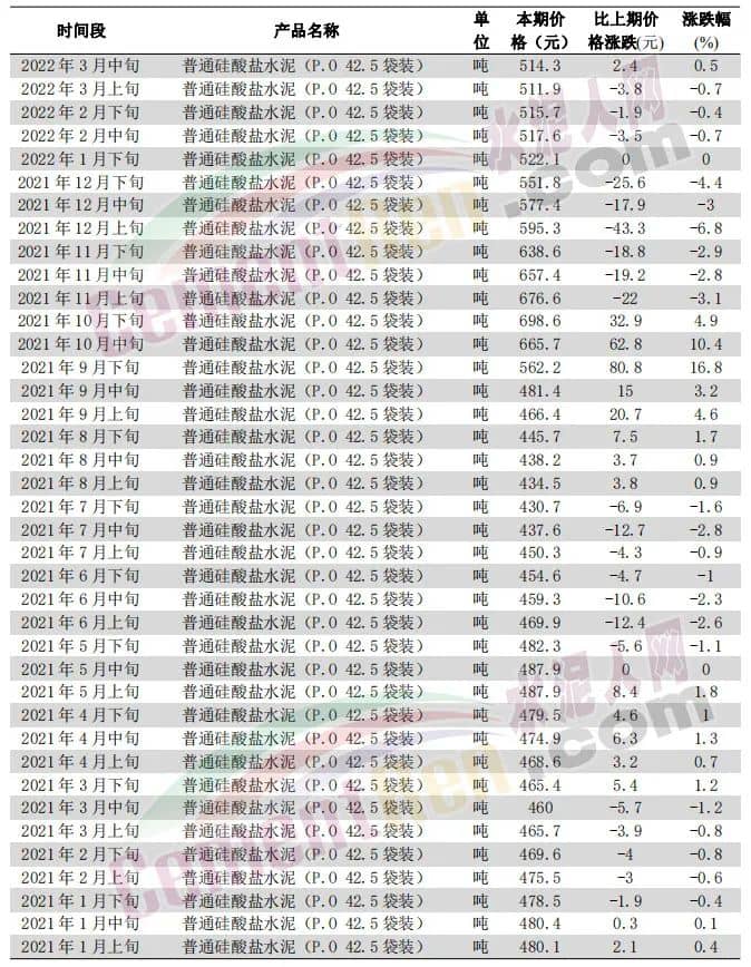 2022年3月中旬普通硅酸鹽水泥(P.O 42.5袋裝)為514.3元/噸,2021年1月上旬普通硅酸鹽水泥(P.O 42.5袋裝)為480.1元/噸,上漲了34.2,漲幅7.12%。煤價(jià)漲超50%,水泥卻未漲過(guò)10%。