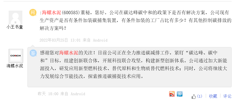 海螺水泥表示,目前公司正在全力推進(jìn)碳減排工作,緊盯“碳達(dá)峰、碳中和”目標(biāo),組建創(chuàng)新聯(lián)合體,開展科技聯(lián)合攻堅(jiān),構(gòu)建新型創(chuàng)新體系。公司通過(guò)加大新能源投入,研發(fā)應(yīng)用新型燃料技術(shù)、替代原料和生物質(zhì)替代燃料技術(shù);同時(shí),公司將繼續(xù)大力發(fā)展綜合節(jié)能技改,探索推進(jìn)碳捕捉技術(shù)應(yīng)用。