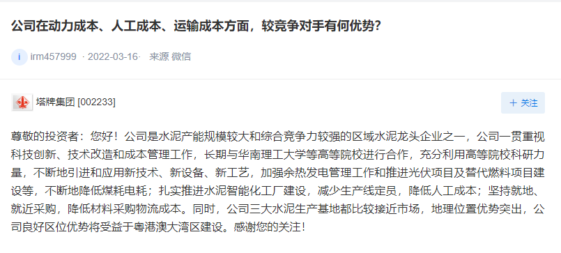 塔牌水泥表示,公司將繼續(xù)做強(qiáng)做精現(xiàn)有水泥主業(yè),通過(guò)加快推進(jìn)替代燃料、光伏儲(chǔ)能項(xiàng)目、分別粉磨配制水泥及智能工廠建設(shè)等措施積極節(jié)能減排降碳,不斷提高水泥主業(yè)競(jìng)爭(zhēng)力。將不斷地引進(jìn)和應(yīng)用新技術(shù)、新設(shè)備、新工藝,加強(qiáng)余熱發(fā)電管理工作和推進(jìn)光伏項(xiàng)目及替代燃料項(xiàng)目建設(shè)等,不斷地降低煤耗電耗;扎實(shí)推進(jìn)水泥智能化工廠建設(shè),減少生產(chǎn)線定員,降低人工成本;堅(jiān)持就地、就近采購(gòu),降低材料采購(gòu)物流成本。