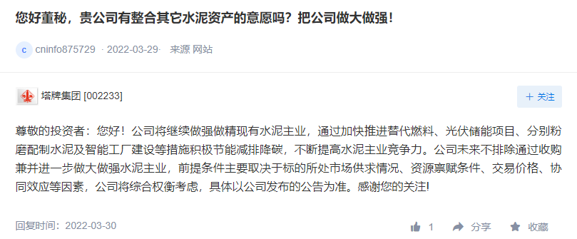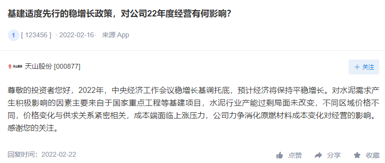 在應(yīng)對(duì)需求減少,成本增加方面,天山股份表示,2022年,中央經(jīng)濟(jì)工作會(huì)議穩(wěn)增長(zhǎng)基調(diào)托底,預(yù)計(jì)經(jīng)濟(jì)將保持平穩(wěn)增長(zhǎng)。對(duì)水泥需求產(chǎn)生積極影響的因素主要來(lái)自于國(guó)家重點(diǎn)工程等基建項(xiàng)目,水泥行業(yè)產(chǎn)能過(guò)剩局面未改變,不同區(qū)域價(jià)格不同,價(jià)格變化與供求關(guān)系緊密相關(guān),成本端面臨上漲壓力,公司力爭(zhēng)消化原燃材料成本變化對(duì)經(jīng)營(yíng)的影響。針對(duì)電價(jià)上漲將積極實(shí)施各項(xiàng)舉措降低電耗,持續(xù)優(yōu)化用電結(jié)構(gòu),應(yīng)對(duì)電價(jià)變化對(duì)生產(chǎn)成本的影響。