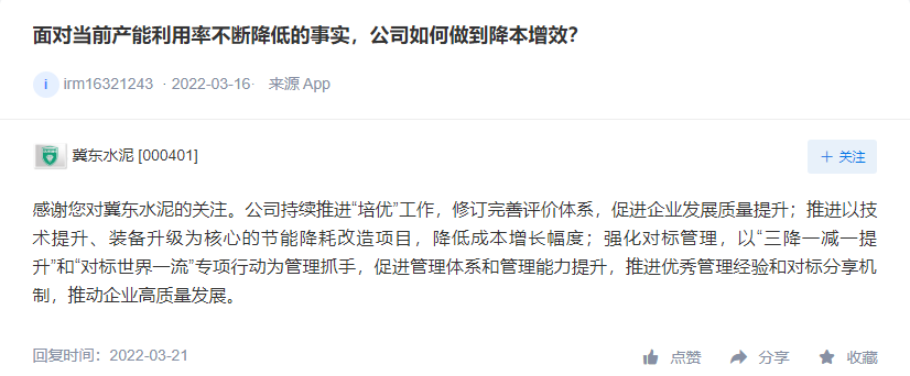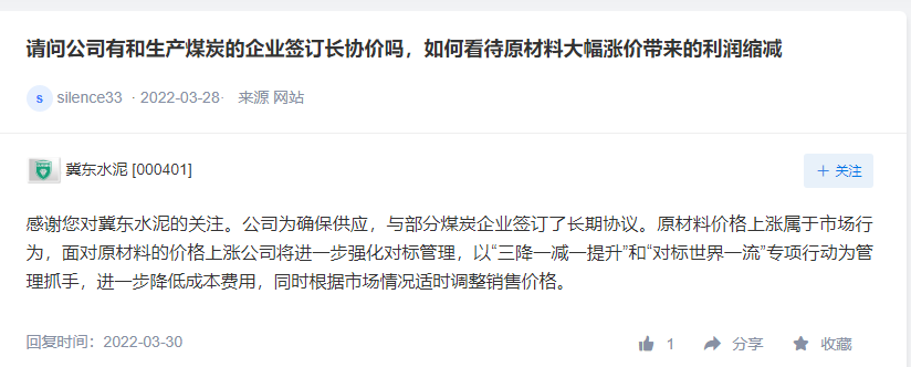 冀東水泥表示,公司為確保供應(yīng),與部分煤炭企業(yè)簽訂了長(zhǎng)期協(xié)議。原材料價(jià)格上漲屬于市場(chǎng)行為,面對(duì)原材料的價(jià)格上漲公司將進(jìn)一步強(qiáng)化對(duì)標(biāo)管理,以“三降一減一提升”和“對(duì)標(biāo)世界一流”專項(xiàng)行動(dòng)為管理抓手,進(jìn)一步降低成本費(fèi)用,同時(shí)根據(jù)市場(chǎng)情況適時(shí)調(diào)整銷售價(jià)格。公司將推進(jìn)以技術(shù)提升、裝備升級(jí)為核心的節(jié)能降耗改造項(xiàng)目,降低成本增長(zhǎng)幅度。