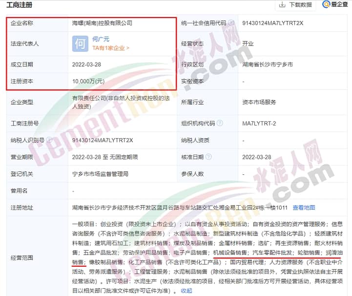 海螺(湖南)控股有限公司于2022年3月28日成立,法定代表人為何廣元,注冊(cè)資本1億元,經(jīng)營(yíng)范圍包含電子產(chǎn)品銷售;機(jī)械設(shè)備銷售;汽車零配件批發(fā);輪胎銷售;潤(rùn)滑油銷售等。企查查股權(quán)穿透顯示,該公司由海螺水泥100%控股。