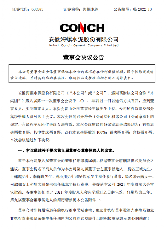 日前,海螺水泥發(fā)布公告稱,安徽海螺水泥股份有限公司第八屆第十一次董事會審議通過關(guān)于提名第九屆董事會董事候選人的議案。根據(jù)董事會薪酬及提名委員會之建議,董事會提名王誠先生、王建超先生、李群峰先生、周小川先生和吳鐵軍先生擔(dān)任執(zhí)行董事,提名張云燕女士、何淑懿女士和屈文洲先生擔(dān)任第九屆董事會獨(dú)立非執(zhí)行董事。各董事的任職于2021年度股東大會選舉通過之日起生效,任期均為三年。