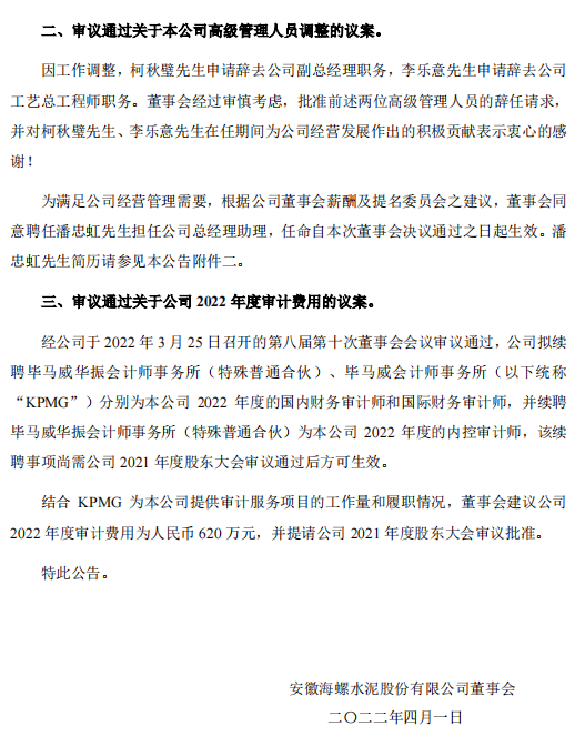 3月18日祁連山水泥發(fā)布《關(guān)于更換董事及調(diào)整高級管理人員的公告》稱:公司非獨(dú)立董事李生鈺先生因工作調(diào)整不再擔(dān)任公司董事及董事會戰(zhàn)略委員會委員職務(wù),同時提名于凱軍先生為公司第九屆董事會非獨(dú)立董事候選人;公司副總裁李生鈺先生、林海平先生因工作調(diào)整,不再擔(dān)任公司副總裁一職,擬聘任李向春先生為公司副總裁。