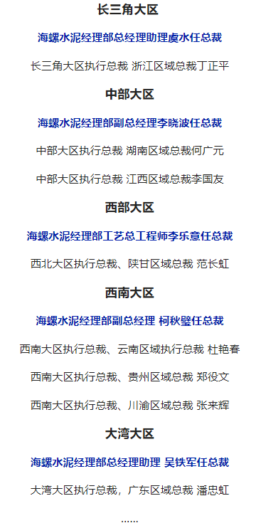 2022年元月海螺水泥原區(qū)域主任改為執(zhí)行總裁,并由總部公司經(jīng)理部管理層領(lǐng)導(dǎo)兼任大區(qū)總裁。