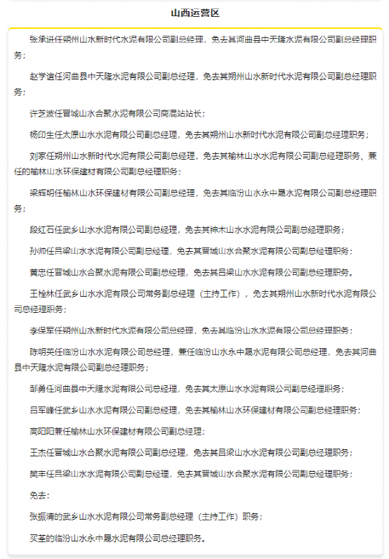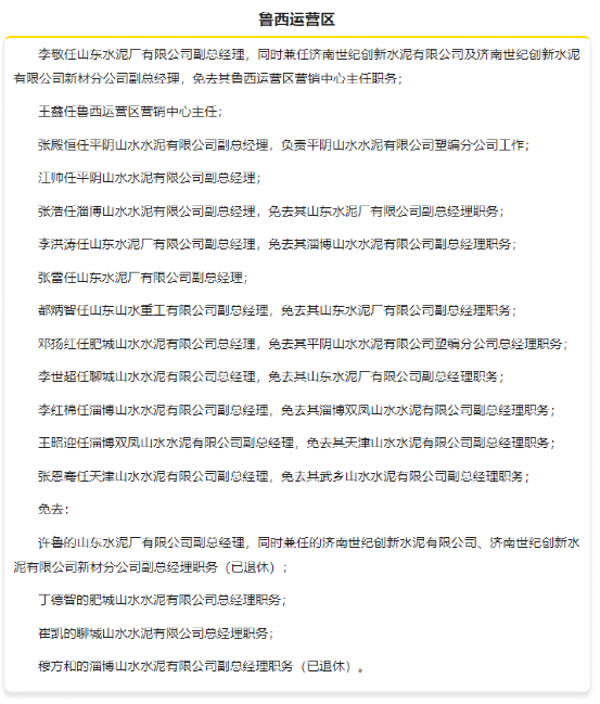 1月中旬,山東山水集團(tuán)有限公司發(fā)布人事任命,對旗下多個運(yùn)營區(qū)進(jìn)行人事調(diào)整,涉及魯西、魯東、魯南、東北和山西等多個區(qū)域。