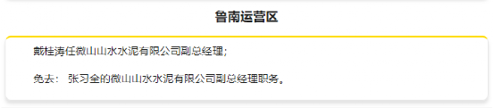1月17日,葛洲壩水泥召開干部大會,宣讀了干部任免文件:桂桐生任葛洲壩水泥公司黨委書記,委派為葛洲壩水泥公司董事長;楊丹任葛洲壩水泥公司黨委副書記,推薦為葛洲壩水泥公司總經(jīng)理,委派為葛洲壩水泥公司董事;免去付軍葛洲壩水泥公司黨委書記、黨委常委、黨委委員職務(wù),不再擔(dān)任葛洲壩水泥公司董事長、董事職務(wù)。