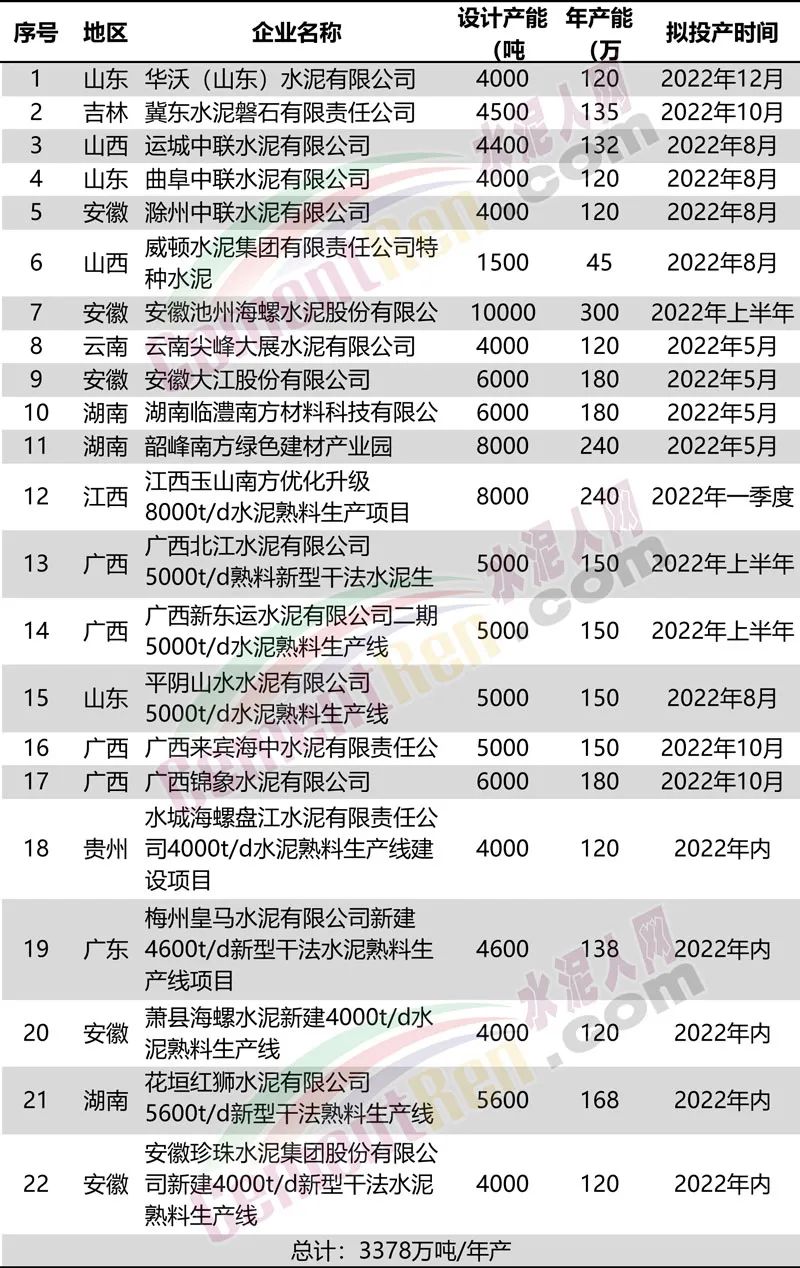 據(jù)水泥人網(wǎng)不完全統(tǒng)計,計劃于今年內(nèi)投產(chǎn)的22條生產(chǎn)線除一條特種水泥生產(chǎn)線外,其他21條生產(chǎn)線單線產(chǎn)能最小為4000t/d,合計產(chǎn)能達3000萬噸/年以上。其中包括池州海螺10000t/d生產(chǎn)線,南方水泥兩條8000t/d和一條6000t/d生產(chǎn)線,廣西錦象水泥一期6000t/d生產(chǎn)線和紅獅水泥一條5600t/d生產(chǎn)線。