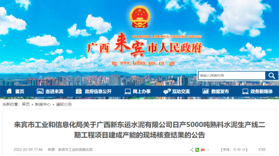 日前廣西來賓市工業(yè)和信息化局發(fā)布公告稱,已于2022年3月1日,組織廣西水泥行業(yè)協(xié)會專家組到廣西新東運水泥有限公司已建成的5000t/d熟料水泥生產(chǎn)線二期工程項目產(chǎn)能進行現(xiàn)場核實并出具了核查一致結(jié)果公告。