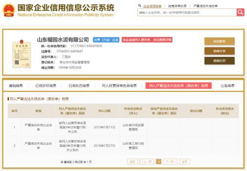 以山東榴園水泥有限公司為例,企業(yè)在2018年7月27日被山東省工商行政管理局列入嚴重違法失信企業(yè)名單,列入原因為被列入經(jīng)營異常名錄屆滿3年仍未履行相關(guān)義務(wù)。2019年7月11日再次被山東省市場監(jiān)督管理局列入嚴重違法失信企業(yè)名單,列入原因仍為被列入經(jīng)營異常名錄屆滿3年仍未履行相關(guān)義務(wù)。