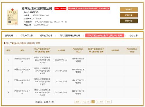 湖南泓溧水泥有限公司2018~2020年連續(xù)三年被列入嚴重違法失信企業(yè)名單 ,目前狀態(tài)為吊銷,未注銷。
